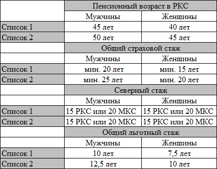 - для мужчин и женщин требуемый «северный» стаж составляет РКС -15 лет или МКС -20 лет